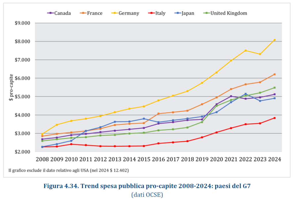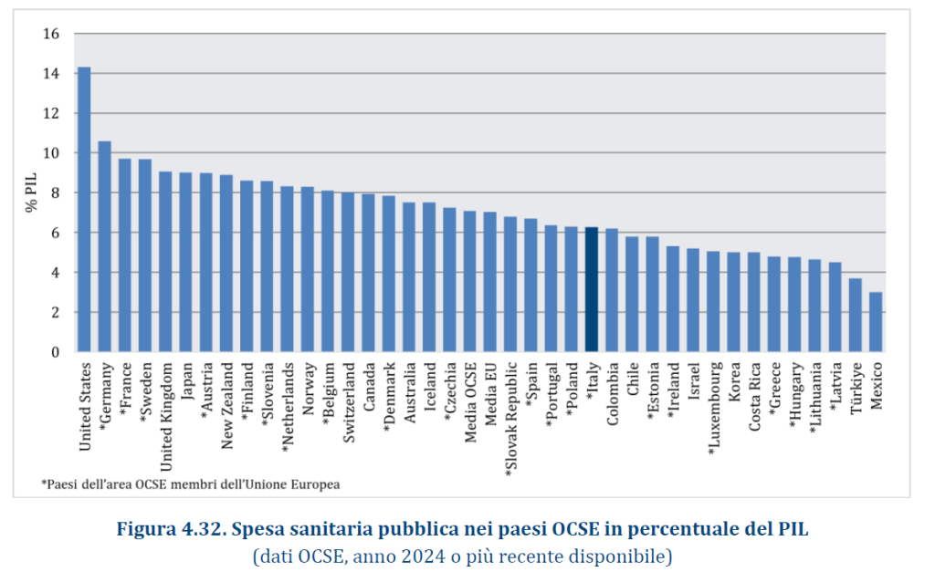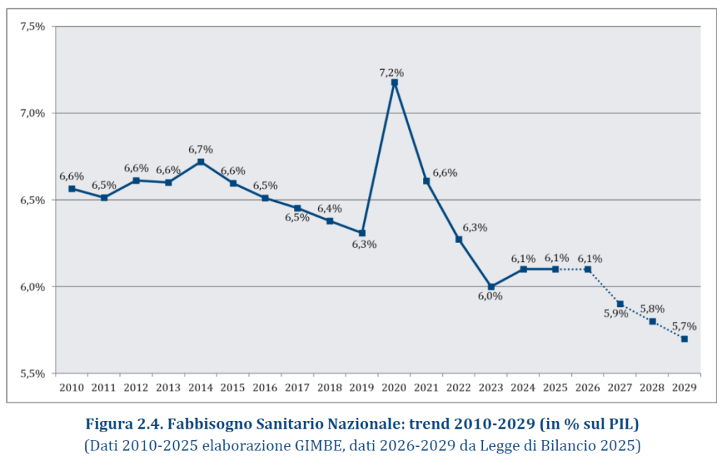 La situazione peggiora anche rispetto al Fondo sanitario nazionale che, in rapporto al Pil, scende al 6,1% per il biennio 2024-2025: un dato che, dietro l’aumento nominale delle risorse, rivela in concreto un “imponente e costante definanziamento strutturale”, che mina la tenuta del sistema sanitario pubblico.