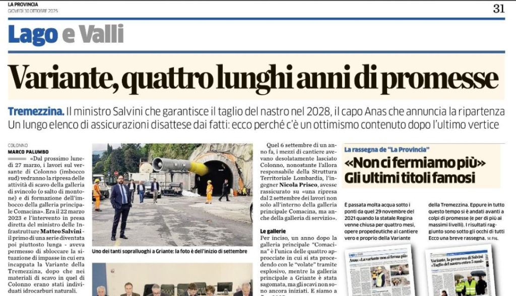 VARIANTE TREMEZZINA: “Salvini si occupi di garantire piena ripresa dei lavoro, non del Ponte sullo Stretto”