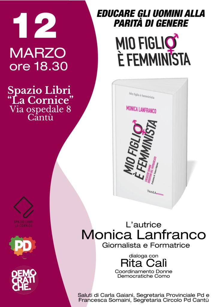 Giovedì 12 marzo alle ore 18.30, presso lo Spazio Libri ‘La Cornice’ di via Ospedale 8 a Cantù si terrà la presentazione del libro “Mio figlio è femminista. Crescere uomini disertori del patriarcato” (VandA Edizioni) della giornalista e formatrice Monica Lanfranco.