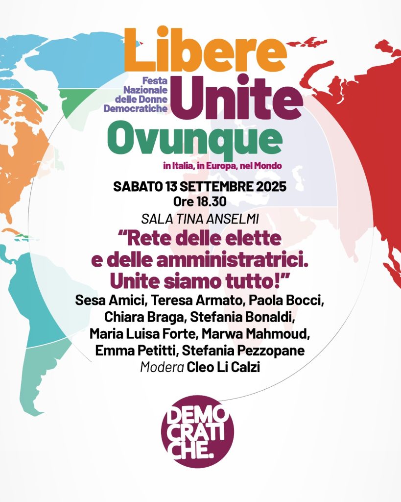 Sabato 13 settembre 2025 alle ore 18:30 si terrà la Festa nazioanale delle Donne Democratiche, l’incontro “RETE DELLE ELETTE E DELLE AMMINISTRATRICI, UNITE SIAMO TUTTO!” L’appuntamento è presso la Festa Nazionale de l’Unità di Reggio Emilia, Iren Green Park, via dell’Aeronautica, 17.