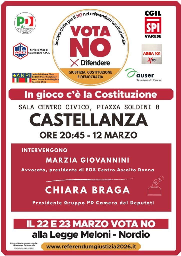 Giovedì 12 marzo 2026 il PD Castellanza con Spi Cgil Varese, Acli, Anpi, Auser, Arci, invita all’incontro pubblico: “VOTA NO. IN GIOCO C’E’ LA COSTITUZIONE“. L’evento avrà luogo alle  ore 20:45 presso la Sala del Centro Civico di piazza Soldini, 8 a CASTELLANZA (VA).