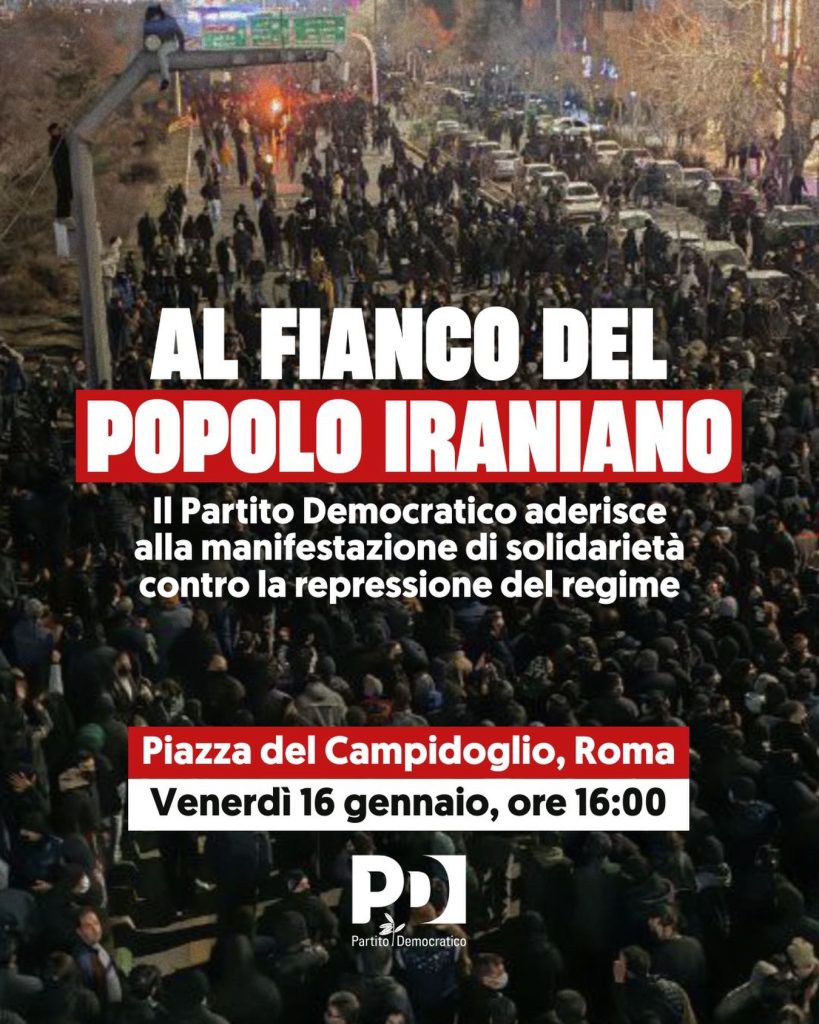 Venerdì 16 gennaio 2026 il Partito Democratico parteciperà alla manifestazione “AL FIANCO DEL POPOLO IRANIANO” organizzata dal movimento “Donna, Vita, Libertà” e da “Amnisty International” per sostenere l’autodeterminazione del popolo iraniano ed esprimere solidarietà ai manifestanti contro il regime di Teheran, che sta massacrando chi lotta per i diritti e la propria libertà. L’appuntamento si terrà alle ore 16:00 in Piazza del Campidoglio a ROMA.